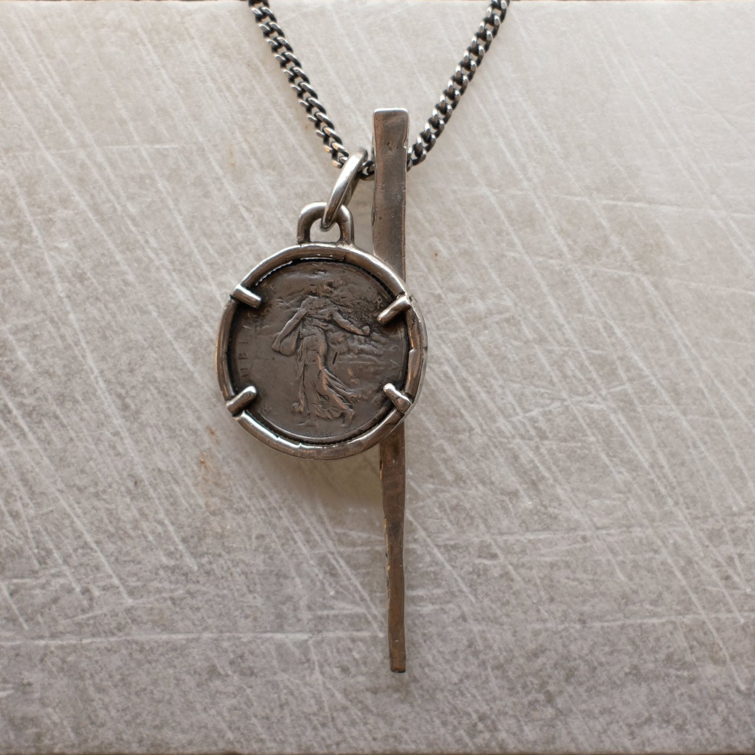 1918 sterling silver French Franc stacked with the classic DE-P2 pendant. This stacked necklace is absolutely stunning. 25" chain.